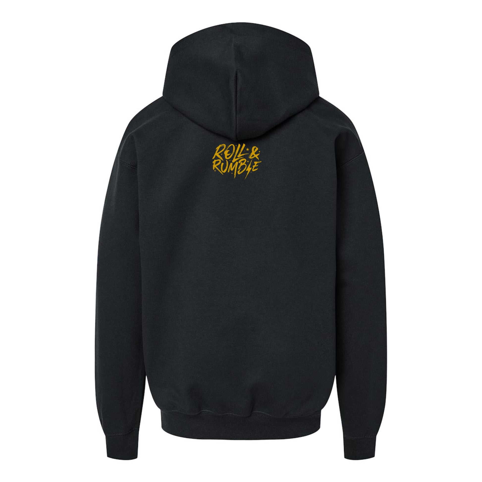 Back Design: On the back of the hoodie, there's a small ROLL & RUMBLE logo, placed near the neckline, to maintain the overall aesthetic without overwhelming the design.